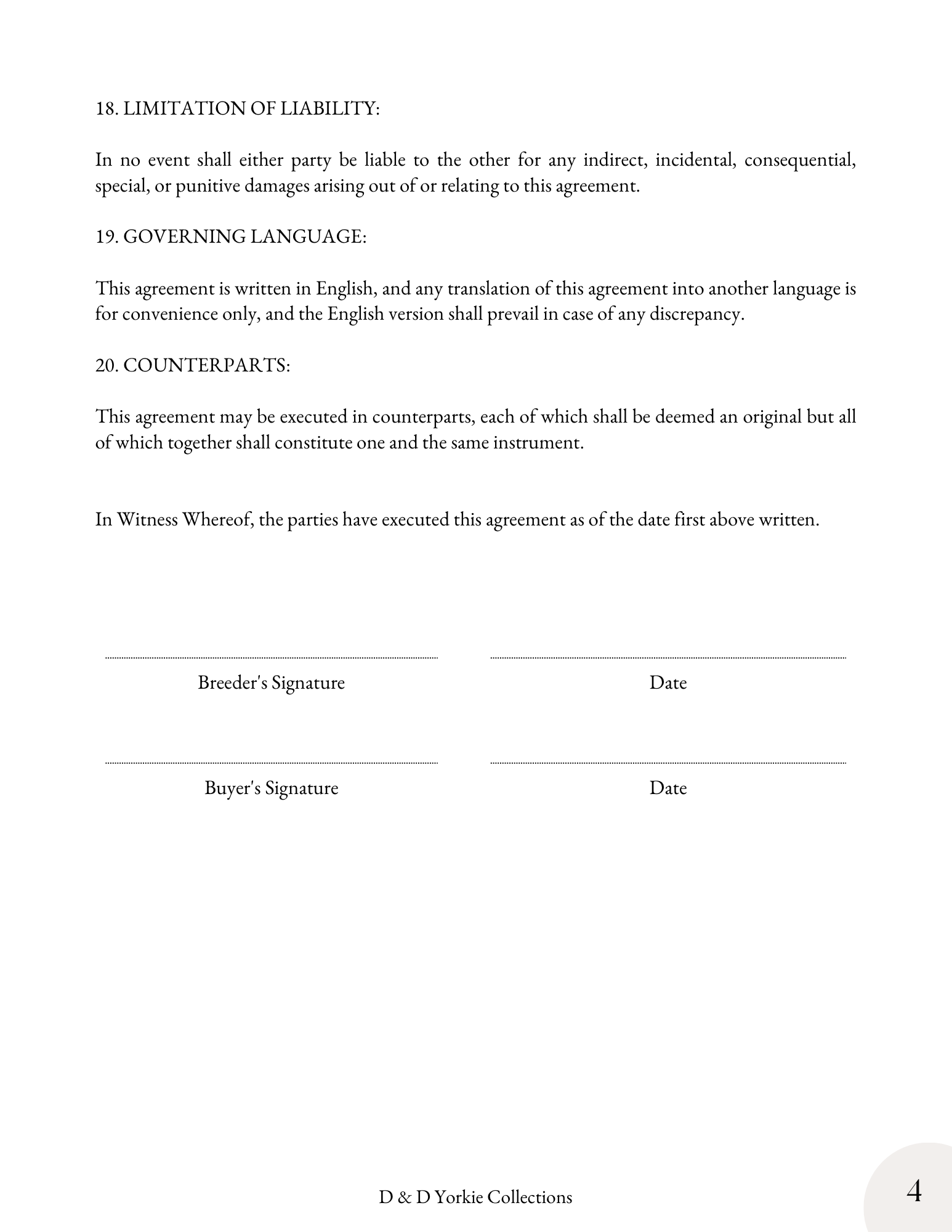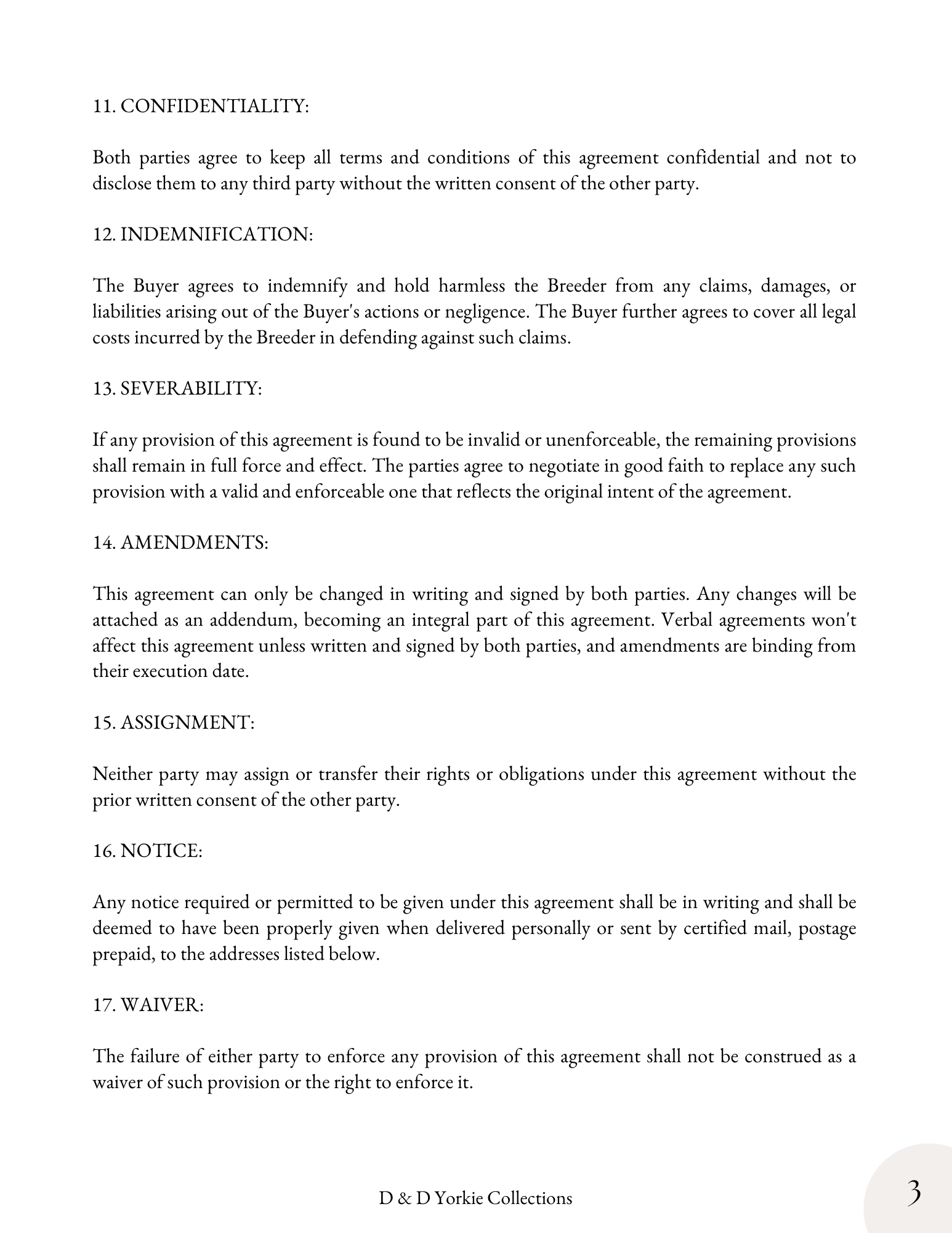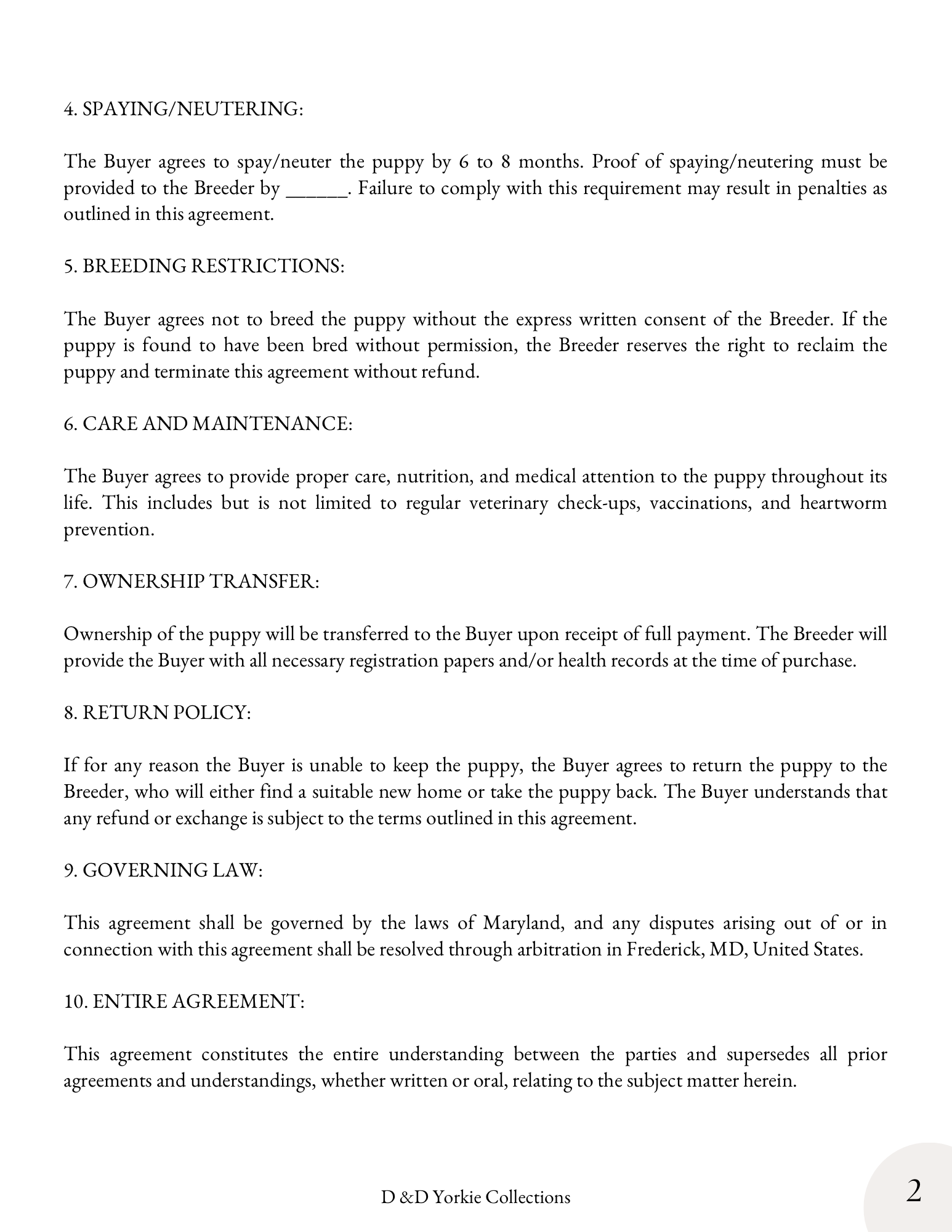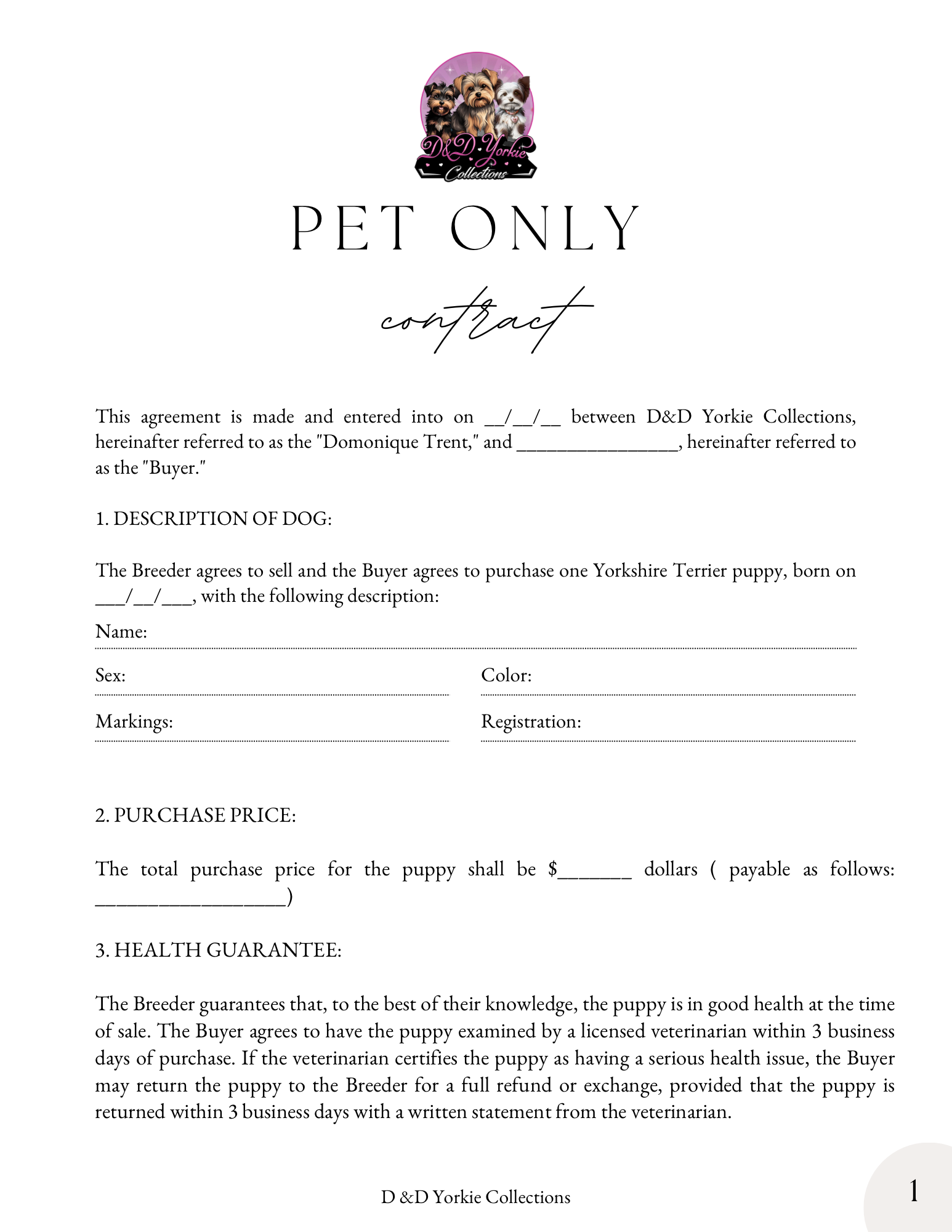 Once the puppy has been picked up or delivered, D&D Yorkie Collections is not responsible for injury, illness, or loss caused by negligence, environmental factors, or improper care.